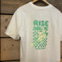 Our new Rockets and Rascals Rise Above graphic T-Shirt in bubble sage font, printed on white smooth unisex blank that is both organic and fair wear - feels lovely on the skin!